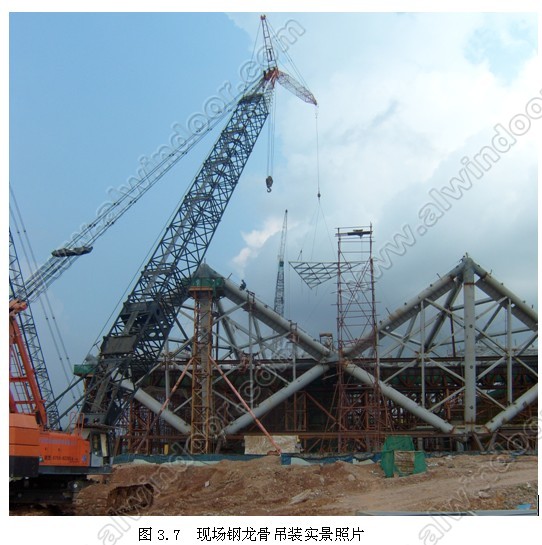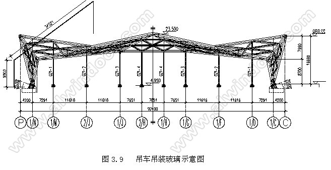 屋面面板安裝主要采用施工馬道進行施工,施工馬道從主體鋼結構面搭設的腳手架,并在部分馬道兩側設置上下安全通道,為了保證在面板安裝作業時減少工人的勞動量,在吊車作業范圍內采用吊車直接進行玻璃面板安裝,在吊車作業之外部位采用電動葫蘆作為材料的垂直運輸。( 如圖3.9~3.10)。