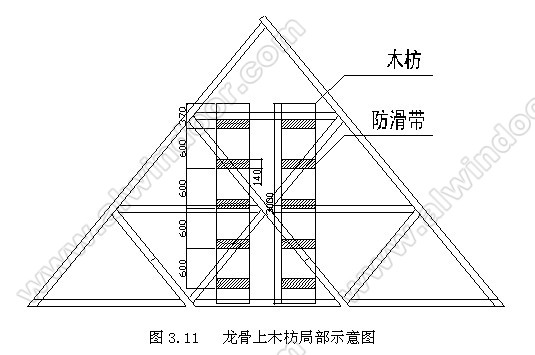 玻璃在屋頂安裝時,由于每個三角的傾斜玻璃較大,特在鋁龍骨上部鋪設特制的底部帶掛鉤的木枋,木枋上部有防滑帶,防止打滑;玻璃由上而下安裝,木枋隨玻璃安裝移動保證安裝安全。(如圖3.11~3.12)