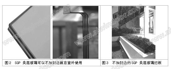邊部穩定性指夾層玻璃邊部外露于大氣條件下的耐久性。PVB夾膠不耐潮濕,水汽作用下容易開膠、分離,要求外露邊緣進行封邊處理。而SGP膠膜有良好的邊部穩定性,對水分不敏感,在外露條件下使用也不會開膠、分離,可以開邊使用,不必封邊(圖2)。所以SGP夾層玻璃可以很方便地用于攔板、雨棚、外挑