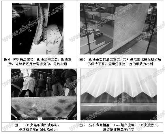 SGP 間膜夾層玻璃整體性好,SGP夾膠膜的撕裂強度是PVB夾膠膜的5倍,即使玻璃萬一破碎,SGP膜還可以粘結碎玻璃形成破壞后的一個臨時結構,其彎曲變形小,還可以承受一定量的荷載而不會整片下墜。這就大大提高了玻璃的安全性(圖5、圖6)。