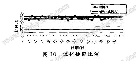 從圖10可以看出,在拉引量大幅變化的情況下,通過采取合理的熔化控制技術(shù),將每天由熔化引起的如氣泡、雜物等缺陷,其在當(dāng)天點狀缺陷中所占的比例可以被有效地控制在一個相對穩(wěn)定的范圍內(nèi)。
