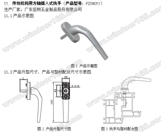 11.3適用范圍 適用于有標(biāo)準(zhǔn)歐式槽口的塑鋼、純木、鋁木復(fù)合等平開門、窗,推拉門、窗。 11.4結(jié)構(gòu)特點(diǎn) 本產(chǎn)品主要采用優(yōu)質(zhì)鋁合金壓鑄及POM工程塑料注塑。表面采用純聚酯粉末噴涂。 11.5性能特點(diǎn) 執(zhí)手轉(zhuǎn)動(dòng)靈活,定位精確牢固,安裝便捷。反復(fù)啟閉3萬(wàn)次,使用功能正常,部件無(wú)變形或損壞現(xiàn)象。 11.6安裝要求 在扇型材正面按圖4開好孔,放入執(zhí)手,轉(zhuǎn)動(dòng)裝飾蓋,使螺釘孔外露,用M5的沉頭螺釘將其與傳動(dòng)器固定好,再使裝飾蓋復(fù)位。 11.7 委員會(huì)組織的實(shí)際檢測(cè)結(jié)果 力學(xué)性能測(cè)試結(jié)果: 空載時(shí)操作力矩為1.8N•m,操作力為36 N。反復(fù)啟閉30000個(gè)循環(huán)后,空載操作力矩0.7N•m,操作力14N,開啟自定位位置與原設(shè)計(jì)偏差為1°16′、關(guān)閉自定位位置與原設(shè)計(jì)偏差為1°16′。執(zhí)手在25N•m~26N•m力矩的作用下,各部件未損壞,執(zhí)手手柄軸線位置偏移2°24′,執(zhí)手在承受600N拉力作用后,執(zhí)手柄最外端最大變化范圍1.20mm。 附建筑門窗配套件委員會(huì)抽樣,委托有關(guān)檢測(cè)機(jī)構(gòu)對(duì)該產(chǎn)品檢測(cè)的報(bào)告。