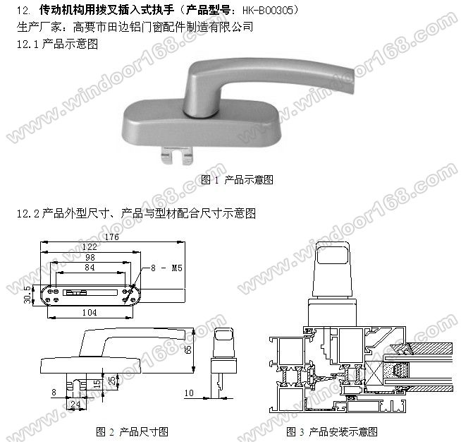12.3適用范圍 適用于各種歐標(biāo)20槽隔熱鋁合金型材內(nèi)平開窗。 12.4結(jié)構(gòu)特點(diǎn) 把手柄、基座、撥叉采用鋅合金經(jīng)高壓壓鑄而成,金屬與尼龍相結(jié)合,使產(chǎn)品操作更暢順、更耐用,表面為純聚酯型粉末噴涂。 12.5性能特點(diǎn) 反復(fù)啟閉25000次后,執(zhí)手在25N•m力矩的作用下,各部件不損壞,執(zhí)手手柄軸線位置偏移小于5°。執(zhí)手在承受600N拉力作用后,執(zhí)手柄最外端最大永久變形量小于5MM。 12.6安裝要求 首先確定把手的安裝位置,在型材上銑出撥叉槽,打好2個(gè)φ5.5的孔,放入把手,用兩個(gè)M5×12內(nèi)六角鏍釘固定執(zhí)手。 12.7 委員會(huì)組織的實(shí)際檢測(cè)結(jié)果 力學(xué)性能測(cè)試結(jié)果: 空載時(shí)操作力矩為1.20N•m,操作力為22 N。反復(fù)啟閉30000個(gè)循環(huán)后,空載操作力矩1.28N•m,操作力26N,開啟自定位位置與原設(shè)計(jì)偏差為2°30′、關(guān)閉自定位位置與原設(shè)計(jì)偏差為2°20′。執(zhí)手在25N•m~26N•m力矩的作用下,各部件未損壞,執(zhí)手手柄軸線位置偏移3°20′,執(zhí)手在承受600N拉力作用后,執(zhí)手柄最外端最大變化范圍2.10mm。 附建筑門窗配套件委員會(huì)抽樣,委托有關(guān)檢測(cè)機(jī)構(gòu)對(duì)該產(chǎn)品檢測(cè)的報(bào)告。
