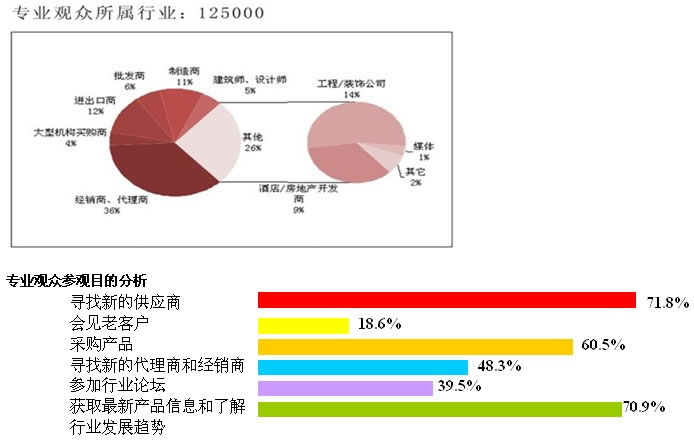 上表可知,上屆展會(huì)貿(mào)易商覆蓋了全國(guó)各地以及海外地區(qū)。國(guó)內(nèi)買(mǎi)家突破了100000萬(wàn)人次,其中45%集中在華南地區(qū)。國(guó)外買(mǎi)家超過(guò)了10000,囊括了東南亞、歐洲、中東、港澳臺(tái)等國(guó)家及地區(qū)。意味著我們的展會(huì)正走向國(guó)際化,堅(jiān)持“以進(jìn)出口為導(dǎo)向”的總體定位,并加大對(duì)國(guó)內(nèi)市場(chǎng)的關(guān)注力度,強(qiáng)力打造我國(guó)知名的國(guó)際建筑裝飾交易盛會(huì)。