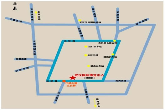武漢國(guó)博中心位于武漢市漢陽(yáng)區(qū)鸚鵡大道619號(hào),多條高速公路和公交車(chē)、巴士專(zhuān)線(xiàn)匯集于此。