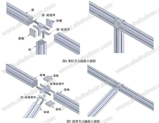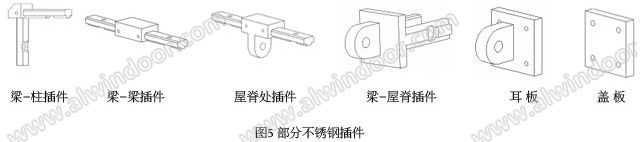 插件由不銹鋼材料進(jìn)行機(jī)械加工而成,主要在梁-梁、梁-柱連接節(jié)點(diǎn)處使用,作為梁-梁、梁-柱連接間的橋梁。由于不銹鋼的各種力學(xué)性能均比鋁合金的高、插件與鋁合金構(gòu)件連接時(shí)在連接處具備一定的連接長度,并且在梁柱等連接部位還用不銹鋼蓋板進(jìn)行了加強(qiáng),保證了連接節(jié)點(diǎn)的受力性能(圖6、圖7)。