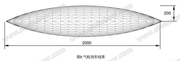 充氣膜的找形分析是尋找內(nèi)壓與膜面預(yù)張力的平衡曲面。給定正常工作內(nèi)壓,膜面預(yù)張力,通過有限元計(jì)算得到平衡曲面,比較平衡曲面與設(shè)計(jì)要求曲面(例如矢跨比),調(diào)整膜面預(yù)張力直至平衡曲面滿足設(shè)計(jì)要求。若調(diào)整后的正常內(nèi)壓下的預(yù)張力過小或過大,則需綜合分析,修正正常工作內(nèi)壓或設(shè)計(jì)方案。本論文利用自行開發(fā)的程序進(jìn)行氣枕的找形和應(yīng)力分析(5)。本雙層ETFE氣枕找形分析時(shí)正常工作內(nèi)壓取400Pa,膜面預(yù)張力取3MPa,得到矢跨比為1/10的膜面形狀(圖8)。