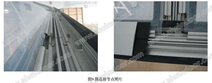 ETFE薄膜在60℃以上時(shí)材料蠕變較大。ETFE薄膜透光性極高,不會因吸收太陽光產(chǎn)生高溫,但固定邊界等連接部通常為金屬材料,易產(chǎn)生高溫導(dǎo)致ETFE薄膜變形。因此連接設(shè)計(jì)在防止漏氣以外,還應(yīng)防止連接處的ETFE薄膜溫度過高。本氣枕的邊界連接采用鋁合金材料,并用橡膠墊片進(jìn)行絕熱(圖9)。