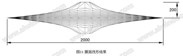 膜面設(shè)計(jì)包含膜面的找形分析、應(yīng)力分析、裁剪分析和連接設(shè)計(jì)。膜面的裁剪分析方法與一般膜結(jié)構(gòu)是一樣的,這里不再贅述。