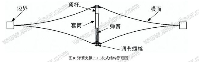 受壓的彈簧可以追隨膜面可能發(fā)生的松弛和變形,從而使膜面保持張緊狀態(tài),同時(shí)膜面還可以通過調(diào)整螺栓進(jìn)行再張緊。彈簧支撐ETFE枕式結(jié)構(gòu)省略了氣枕的充氣系統(tǒng),不存在漏氣隱患,對薄膜結(jié)構(gòu)的密封要求也大大降低。