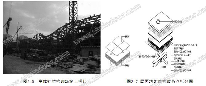 屋面功能層由內向外的構成及其作用分別為:1)150×75×5mm鋼檁條,作為屋面功能層的支撐檁條,在每主體鋼結構主梁間布置兩道,與次梁連接。2)HV-125壓型鋼板,作為功能層的受力底板,鋪設于鋼結構檁條上方。3)防水隔氣膜,具有防止室內水汽進入功能層的作用。4) 150mm巖棉加鋁箔貼面, 功能層的保溫防火層。5)50mm厚玻璃纖維(詞條“玻璃纖維”由行業大百科提供)棉,功能層的吸音層,具有吸收噪音的作用。6)熱反射隔熱膜,具有防水隔熱的作用。7)50×3mm鋼方通次檁條,作為屋面防水層的支撐龍骨,布置于150×75×5mm鋼檁條上方,通過鋼方通與150×75×5mm鋼檁條相連。8)HV-125壓型鋼板,作為屋面防水層的受力層, 50×3mm鋼方通次檁條上方。9)0.6mm厚平板鍍鋅鋼板,作為屋面防水層的底板,鋪設于HV-125壓型鋼板上方,10)1.5mm厚PVC防水卷材,屋面防水層,鋪設于功能層的最外側,起到為整個建筑防水密封的作用。11)φ80×5鋼牛腿,用于支撐屋面裝飾層。