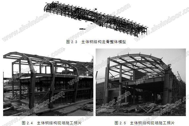 型鋼架,每軸線布置一榀,間距約7~8米,鋼架之間由H型鋼次梁連接,次梁間距約3米,整體鋼結構在入口及