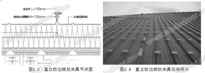 、傺b飾層面板(詞條“面板”由行業大百科提供)的荷載需要傳遞至結構層,傳統做法是通過鋁合金夾具施加在直立鎖邊金屬屋面板板肋上,再由板肋傳遞至結構層(如圖2.8~2.9),但由于本項目屋面造型復雜,中部突變扭曲較大,裝飾層面板與直立鎖邊金屬屋面板因造型需要距離較大,最大處竟達1米多,致使傳遞至直