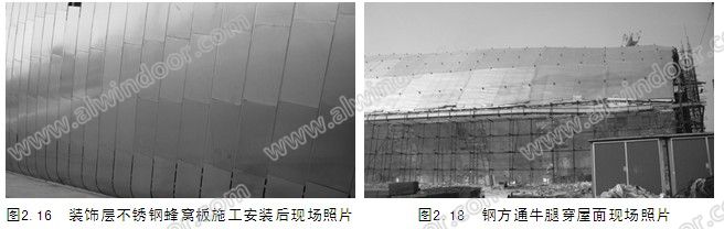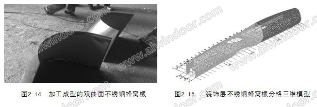 本工程最終的建筑造型需要依靠屋面裝飾層來實現,所以裝飾層面板的選取至關重要。本工程建筑造型復雜,中部扭曲突變較大,雙曲面板塊數量多。建筑方要求建筑表面采用不銹鋼材質,以表現建筑的特色。最初確定的是2.0mm不銹鋼單板,并進行了樣板試制。由于不銹鋼單板材料彈性大,雙曲面加工工藝復雜,加工成型困難,產量低且價格昂貴,無法滿足本工程的需要。后經反復考察研究,選擇了15mm厚不銹鋼蜂窩板作為本工程的裝飾層面板,該種面板可以使用簡易模具進行雙曲成型,具有加工工藝簡單,曲面成型后剛度大不易變形,產量高且價格適中等優點。(如圖2.14)
