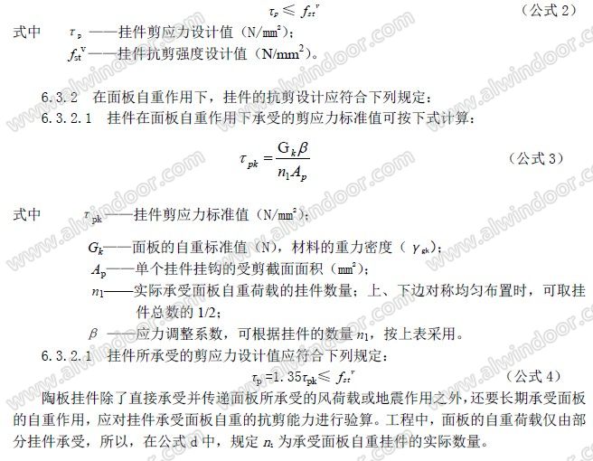 6.3.2.1 掛件在面板自重作用下承受的剪應力標準值可按下式計算: