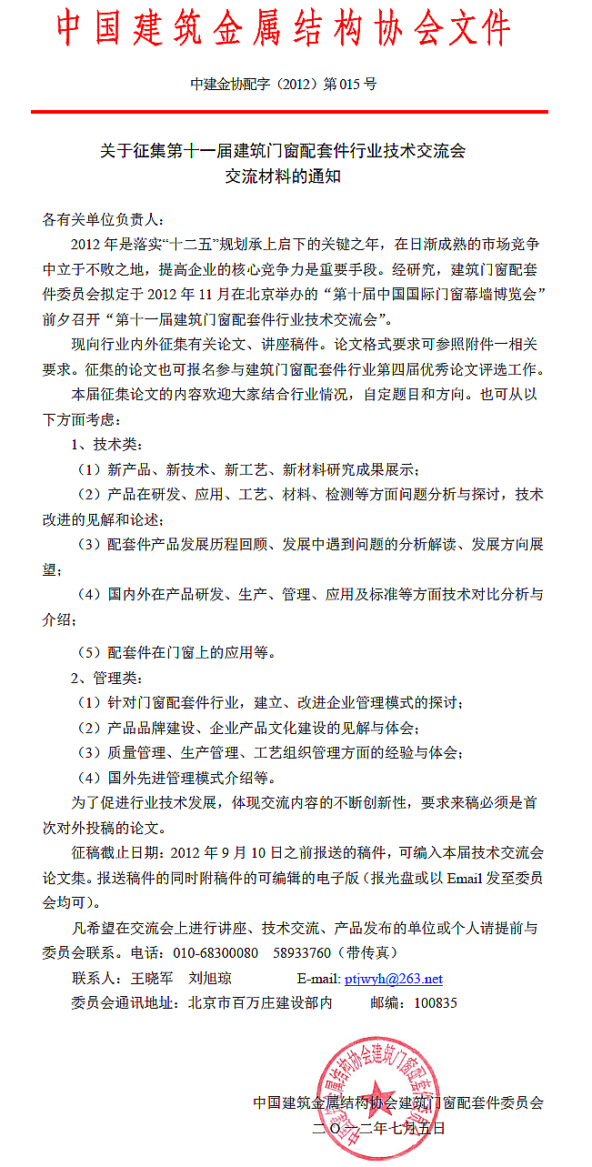 關于征集第十一屆建筑門窗配套件行業技術交流會交流材料的通知