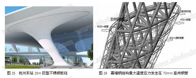 對(duì)杭州東站25m巨柱的溫度應(yīng)力進(jìn)行過兩次實(shí)測(cè),幕墻支承鋼結(jié)構(gòu)最大溫度應(yīng)力發(fā)生于70mm豎向鋼管,數(shù)值僅為45N/mm2,遠(yuǎn)小于鋼管的強(qiáng)度設(shè)計(jì)值215N/mm2(圖25、圖26)。