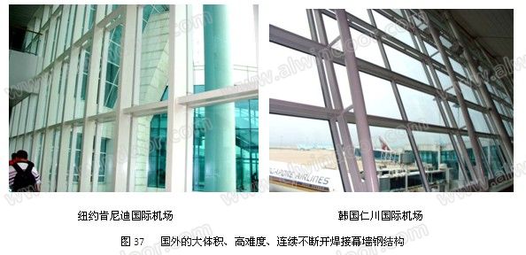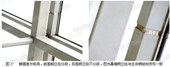 韓國(guó)首爾仁川機(jī)場(chǎng)幕墻就是一個(gè)最典型的例子,幕墻玻璃由鋁立柱和鋼立柱共同支承,鋼立柱與主體鋼結(jié)構(gòu)直接連接。由于鋁材變形遠(yuǎn)遠(yuǎn)大于鋼材,與鋼立柱無法協(xié)調(diào),所以鋁立柱分段;而鋼立柱與主體鋼結(jié)構(gòu)變形相同,所以鋼立柱不必分段(圖27)。