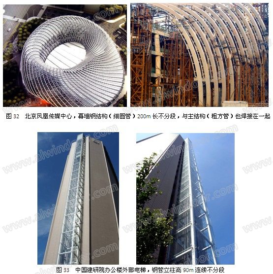 北京鳳凰傳媒中心玻璃幕墻的支承鋼結(jié)構(gòu)長(zhǎng)度達(dá)200m,連續(xù)焊接不分段(圖32)。中國(guó)建筑科學(xué)研究院辦公樓的室外電梯,夾層玻璃方鋼管框架(詞條“框架”由行業(yè)大百科提供)支承,立柱90m高,連續(xù)焊接不分段,無接頭,多年使用沒有問題(圖33)。