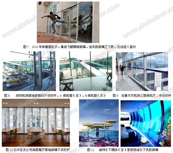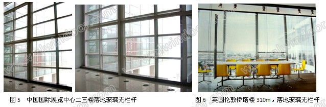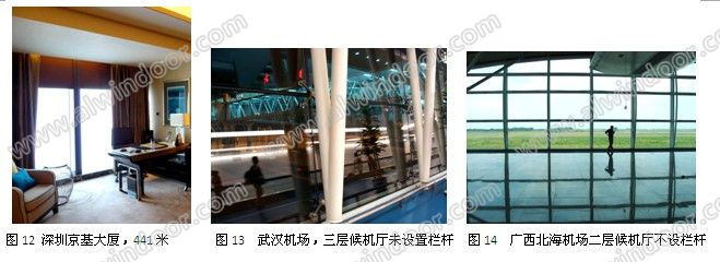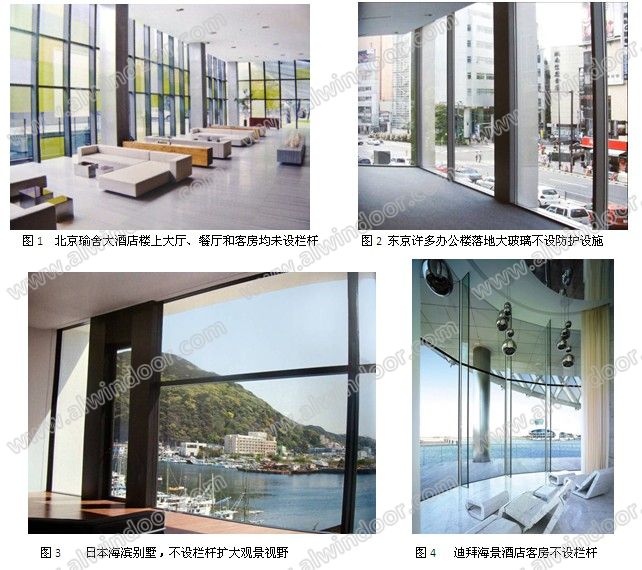 目前我們可以看到國內外許多建筑樓面的落地玻璃沒有設置欄桿(圖1~圖6),雖然我們從外觀上不了解是采用了夾層玻璃還是僅僅用單層玻璃或單層玻璃的中空玻璃,但是肯定一點是:并非所有的落地玻璃都必須設置欄桿,至少相當多的已建工程未做欄桿也已經正常使用多年,并不令人擔心。