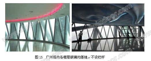 廣州塔高達600m,玻璃幕墻達460m,由于采用雙夾膠中空玻璃,更不必設欄桿了(圖15)。