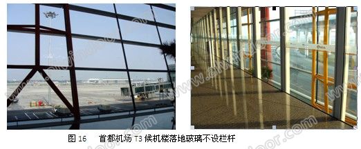 首都機場T3航站樓,外幕墻落地板塊2.5mX3.2m,12mm鋼化雙夾膠中空;內隔斷鋼化夾膠。然有可能受到旅客和行李車的撞擊,也未設置欄桿(圖16)。