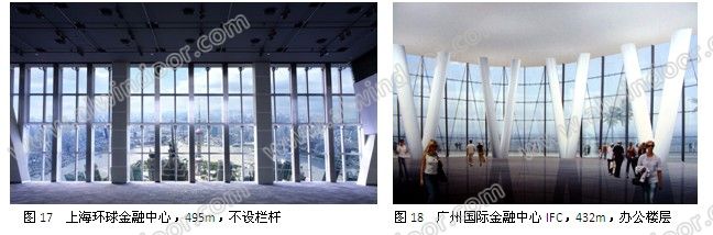 許多超高層建筑玻璃幕墻采用外玻璃夾膠,內玻璃單片(鋼化或半鋼化)的做法。雖然內單片玻璃有破碎的可能,但是由于外玻璃夾膠,不存在人員墜落的危險,所以也可不做欄桿。圖17~圖18的超高層建筑,玻璃幕墻都是外玻璃夾膠,內玻璃單片,這些工程均不設欄桿。當然,幕墻的橫梁最好調整到在900毫米左右的高度布置,這樣會更安全。
