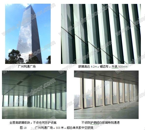 廣州利通廣場是目前國內配置最高的玻璃幕墻,58層,303m高。玻璃高度4.2m,每層一塊,不設中間橫梁,寬度1.5m和2.5m,外玻超白半鋼化SGP夾膠,內玻超白鋼化,鋸齒形墻面(圖19)。大型玻璃不設置欄桿,充分顯示超白玻璃的通透性能。