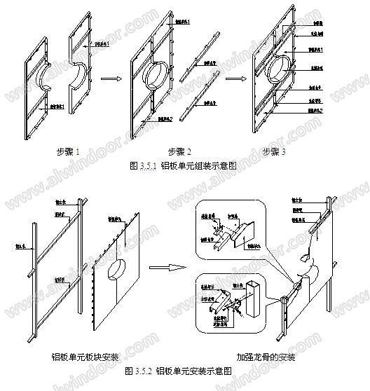 由于本項目鋁板幕墻的絕大多數板塊長度與造型孔洞直徑都不相同,規格眾多,不具備普遍的可替換性。首先,下料前,對鋁板面材進行編號處理,使每塊鋁板編號唯一,能夠表達出此塊鋁板在工程中的空間位置。例如:LM1-105-13即鋁板幕墻1第105列第13塊板所在位置;第二,鋁板到達現場后,將對應的兩個板塊在工作平臺上進行組裝,(如圖3.5.1);第三,吊裝,調整,安裝就位,安裝裝飾扣條。最后固定加強龍骨。(如圖3.5.2)
