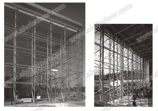 這是一個橢圓型觀光步行的玻璃(幕墻)大屋頂,長約106米,最大跨度36米,離地面高度14米,上下部設計有玻璃的欄桿、展望步行廊、在這一具大的玻璃(幕墻)大屋頂上,還設計配有各種各樣的噴泉。在玻璃(幕墻)大屋頂下面的回廊有4根大柱子,在上面用彎曲的鋼管,通過鋼梁架架設在主體結構之上,以保持足夠強度。屋頂主面采用12㎜+中間膜1.5㎜+12㎜的夾膠鋼化玻璃,走廊均為乳白色,水盤采用透明中間膜,使地面陽光閃閃搖動。H鋼的翼緣面把橡皮條遮蓋,安裝的鐵腳通過DPG構法來支持。固定鐵件藏在夾膠玻璃后面,使之不外露。考慮到配合間的間隙不用硅膠,采用條形橡皮條,橡皮條在工場中做成梯子狀,施工時使各個板塊間連結成一條,因沒打硅膠,侵入的水在橡皮條外圍的槽進行排水。該玻璃(幕墻)的性能:耐風壓±280kgf/㎡(玻璃承載負荷),面內變形1/300無需修補,面變形成1/200無破損、殘留變形(只需硅膠補修)、1/100無破損、脫落。