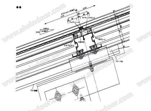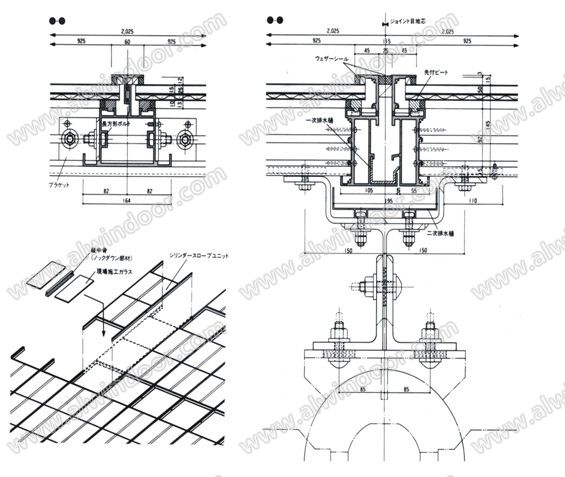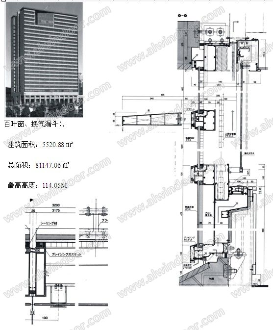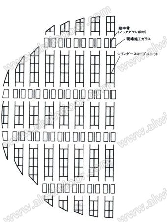 通信大廈的橢圓斜面幕墻,采用大型板塊法組成。圓筒形狀的頂部、設計有斜面大型單元板塊施工的天窗。為使雨水在天窗上排水流暢,橫部襯全部設置在內部,從外觀來看,突出了設計強調的縱向線條感。大型板塊(最大W2025×H8508㎜)只有縱向設有伸縮縫,板塊的縱部襯間注有硅銅膠,設計師還設計了橡膠制的一次性排水導管,在斜面下部集水后,把水排到外部的構造。二次排水槽的間隙是用不銹鋼板卷制的套筒,斜面下方層層重疊,不用硅膠,采用干式收尾。