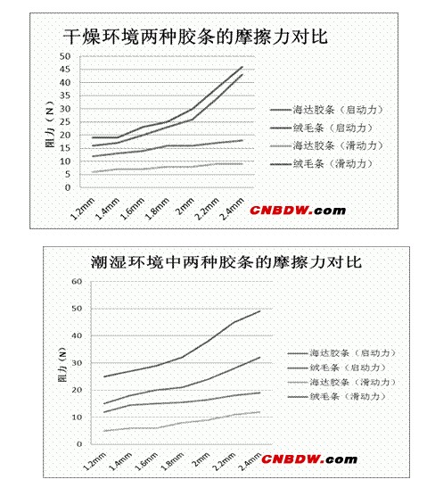 在干態下,新結構的密封條相對于絨毛條有比較好的滑動性,特別在啟動力方面,新結構的膠條,在壓縮量等同的條件下,啟動力也只有絨毛條的70%左右,滑動力只有絨毛條的60%左右,滑動噪音與絨毛條相當。
