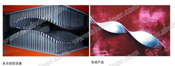 如何解決螺旋百葉加工的問題,成為本工程的一大難點(diǎn)。一般的百葉可以通過鋁材開模來解決,但本工程的百葉為螺旋型,不同位置的截面角度各不同,不能簡單的通過開模來完成。如果采用鋁板或型材在機(jī)器上扭轉(zhuǎn),又達(dá)不到每根百葉的均勻和一致性。經(jīng)過幾番論證,最后我們選擇了無模多點(diǎn)成型技術(shù)。