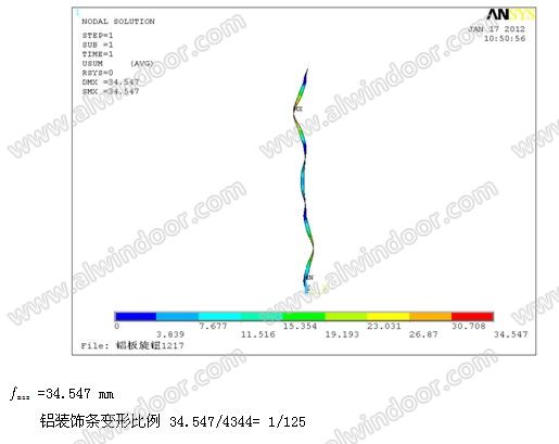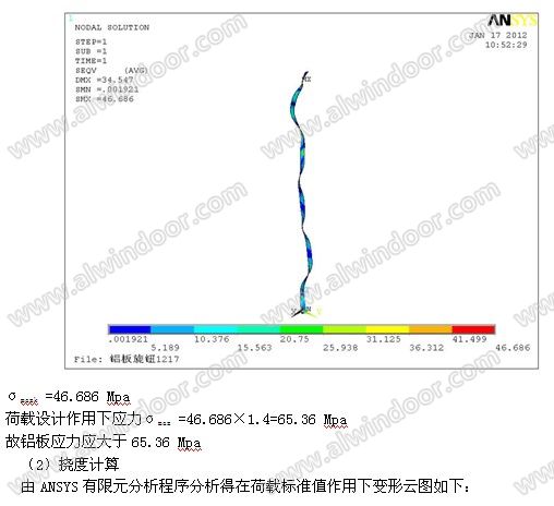3.2.3百葉的強度、撓度計算 (1)強度計算 由ANSYS有限元分析程序分析得在荷載標準值作用下應力云圖如下: