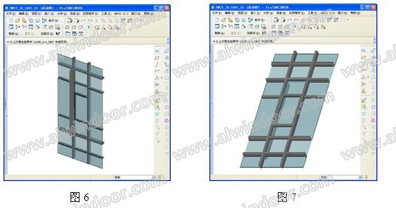 與AutoCAD不同,Pro/E中零件和組件是不同類型的文件。繪制組裝圖時需新建一個組件圖類型的文件,然后將零件和子組件添加到組件圖中,定義各種裝配關(guān)系和裝配尺寸,即得到組裝圖。圖6、圖7為一種單元式幕墻大樣三維模型圖。