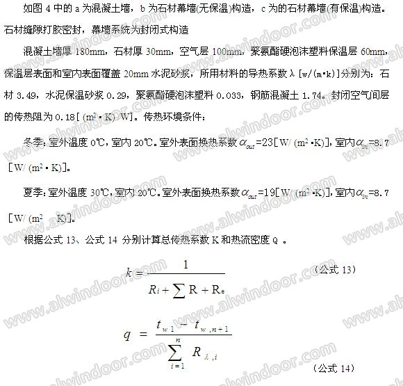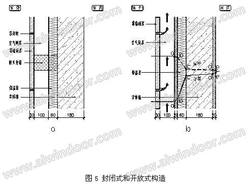 由表中比較可以看出由于石材和空氣層的作用結果: 、 冬季保溫效果明顯。無保溫的石材幕墻構造,熱流密度比單一的混凝土墻體降低了32%;有保溫的石材幕墻構造,則同比降低了83%; 、 夏季隔熱效果同樣明顯。無保溫的石材幕墻構造,熱流密度比單一的混凝土墻體降低了31.55%;有保溫的石材幕墻構造,則同比降低了83%; 、 有保溫和無保溫的石材幕墻構造相比。保溫層的作用也十分明顯。冬季情況下,有保溫比無保溫時熱流密度降低了75.5%;夏季降低了75.2%。 以上計算僅僅是對組成圍護結構墻體的材料導熱性能的熱傳導的計算結果,無論石材幕墻是封閉式還是開放式構造,空氣間層的存在是必然的,由此通氣層中的熱傳遞還應包括輻射傳熱和對流傳熱,由此才能較完整的了解空氣間層和保溫層兩者在幕墻非透明部分中的節能比重和重要性。后面會對此進一步分析。 3.2 開放式構造 所謂開放式設計,就是將石材面層分格縫隙做敞開式處理,不用膠或膠條等任何密封措施。如圖5 所示。一般情況下,石材幕墻的分格縫隙為15~20mm。 圖5 中b 為開放式構造,與圖5.2—2中的c對應,構造尺寸和材料完全一樣。由于其空氣間層有良好的通氣性,熱阻可不考慮。其層間溫度可取進氣溫度,表面換熱系數取12.0 W/(m2K)。根據前述計算方法計算結果:a=29.63℃;b=29.33℃;c=21.27 ℃;d=20.82 ℃; e=20.51℃(18.22)