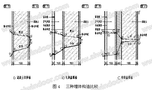 下面對石材幕墻分別在封閉式構造和開放式構造兩種情況下的比較。 3.1 封閉式構造 實體混凝土墻體和石材幕墻有無保溫層對節能的影響我們通過圖4的三種構造進行比較。見圖4。