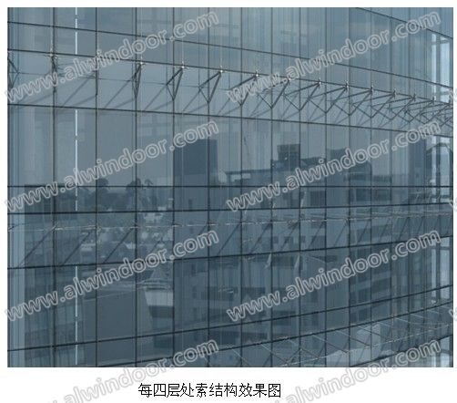 通過建模計算本工程選用了Ø12(Ø14)的不銹鋼索作為承載字幕墻自重和水平風壓的主力受力桿件,每四層(4200mm層高)或三層(6000mm和5000mm層高)采用Ø60×6的不銹鋼支撐桿輔以Ø60×6的不銹鋼桿斜撐,其間每層采用一根Ø60×6的不銹鋼支撐桿。(見節點)