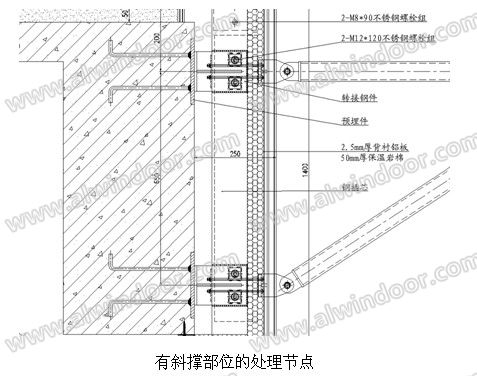 由于采用拉索的結構形式作為字幕墻的主要受力部件,而拉索在工作工況前是需要施加預應力的,因此拉索支撐桿件的力的傳遞也是本工程需要重點考慮部分。本工程在有斜撐的不銹鋼支撐桿件的部位的玻璃幕墻豎向鋁龍骨間加入了鋼插芯(見節點圖),在每個不銹鋼支撐桿與玻璃幕墻豎向鋁龍骨的鏈接處加上了轉接件,直接將不銹鋼支撐桿上的力通過轉接件傳到主體結構上,而不通過玻璃幕墻的主要受力部件(豎向鋁龍骨)傳力,這樣的措施同時保證了兩種幕墻體系受力的安全性。