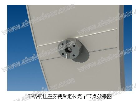 A.針對掛點的可調節性,本工程采用了一根帶可滑動螺栓槽的鋁合金型材預先焊接在篆體字的筆畫中(見效果圖),同時也預先安置一根螺桿在型材的螺栓槽中,再安裝不銹鋼索固定件,在掛裝的時候,當橫向的可調節螺栓槽和豎向的不銹鋼索有焦點時,此焦點就是安裝掛點,橫向的螺栓槽長就是掛點的可調節長度,根據字體筆畫的不同寬度,掛點的可調節范圍約為±100mm之間,此調節范圍足以滿足消除幕墻施工和字體加工中產生的誤差。