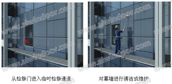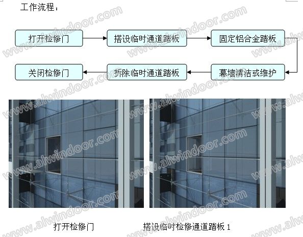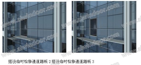 制作一組6~7個鋁合金格柵踏板即可,輪換使用,清洗人員擦洗到哪里就安裝到哪里,直到此層篆字幕墻的另一端,不需要每層滿鋪。需進行清洗和維護工作時,可卸下玻璃幕墻上的上懸窗撐桿,取消上懸窗的開啟限位,通過懸窗進入兩層幕墻間的檢修通道。篆字幕墻及篆字后的玻璃幕墻的維護或者玻璃破損后的更換都可以使用本方案。