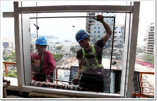 玻璃幕墻的安裝必須在吊欄上完成,每當張新強和工友劉仰兵舉起沉重的玻璃時,吊欄便會在空中搖擺,看得人膽戰心驚。不得已,他們只能用橡膠繩把吊欄緊緊地拴在窗框上。“高空作業的危險性是有的,保護措施要做好,自己也要格外小心。”劉仰兵說。每天近10小時的工作,劉仰兵和張新強能裝30多塊小的玻璃幕墻。