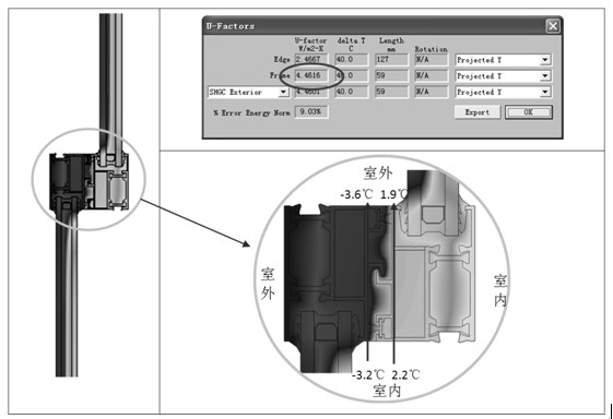 因此,在窗上下框滑道之間增設(shè)一個PVC材質(zhì)的卡槽結(jié)構(gòu)設(shè)計可有效阻斷室內(nèi)熱空氣與室外冷型材接觸,避免該處產(chǎn)生結(jié)露現(xiàn)象,且顯著改善傳熱系數(shù),提高推拉窗的隔熱保溫性能,該設(shè)計理念是科學(xué)合理的。
