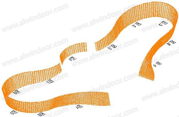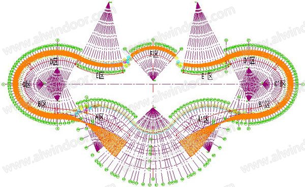 邯鄲文化藝術(shù)中心鍍銅GRC板幕墻造型由連續(xù)曲面組成(圖7),采用開縫式鱗片疊合造型,幕墻高度隨曲面的延伸高低變化、平滑過渡。幕墻按平面半徑的不同共分為11個(gè)區(qū)(圖8),包括A區(qū)、B區(qū)、C區(qū)、D區(qū)、E區(qū)、A’區(qū)、B’區(qū)、C’區(qū)、D’區(qū)、E’區(qū)、F區(qū)。
