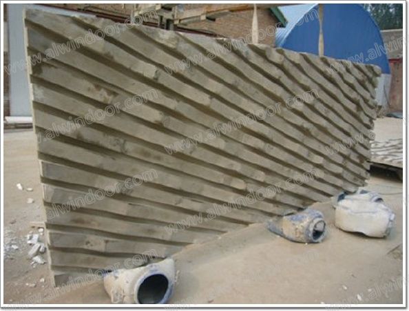 邯鄲文化藝術(shù)中心GRC板噴射成型、脫模后,按建筑設(shè)計(jì)效果要求,需進(jìn)行波浪起伏條紋面的剔鑿,剔鑿采用人工剔鑿的隨機(jī)剔鑿方式,剔鑿量按條紋表面面積的百分比5%、10%、15%進(jìn)行隨機(jī)控制,以達(dá)到自然、滄桑的歷史厚重感(圖28~圖29)。