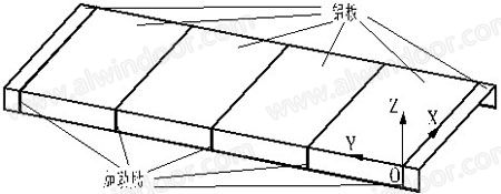 槽型鋁板單元板塊結構如圖1所示,由槽型鋁板和5條加勁肋組成。槽型鋁板與加勁肋(可看作門式框架)由鉚釘緊固,槽型鋁板與加勁肋在緊密接觸處x、y、z方向線位移和角位移應協調一致,加勁肋轉折處采用連接片連接,每側2個螺絲固定,能承擔約束力矩及約束反力,可視為剛結點[9-10]。一般情況下,在風荷載作用下的槽型鋁板與加勁肋的內力與變形計算均簡化為平面問題且各自獨立計算。為更好地模擬槽型鋁板和加勁肋之間的空間協調變形及承載能力,槽型鋁板可視為空間殼體結構[11],加勁肋視為空間梁,二者協同承擔荷載。