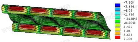 Z方向的最大應力為7.308MPa,發生在每塊鋁板兩側板的中部區域。