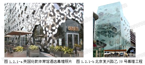 1.2.1、 英國倫敦體育館酒店的外幕墻就是采用了3mm厚的鋁單板,在平板(詞條“平板”由行業(yè)大百科提供)面上進(jìn)行幾何形狀的裁剪,剪切成多種不等邊的多邊形,根據(jù)建筑設(shè)計的要求拼裝成幕墻的平面幾何形狀,很好的展示了該建筑幕墻的特性(如圖1.2.1-a)。