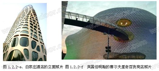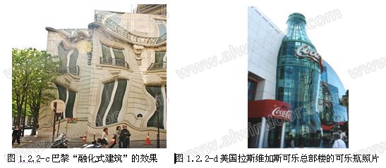 巴黎“融化式建筑”的出現(xiàn),打破了我們對建筑的一般理解。是異形建筑的一個大膽的探索,它使用了視錯覺技術(shù)造成的效果,給了異形建筑和異形門窗(詞條“門窗”由行業(yè)大百科提供)幕墻以全新的認(rèn)識.這類建筑的“特征顯著”個性極強(qiáng)。(如圖1.2.2-c)