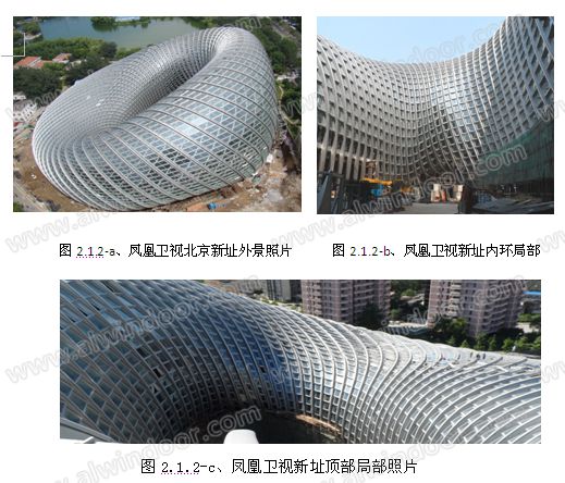 (1)、鳳凰衛(wèi)視在北京的新址全部采用了不規(guī)則的菱形平板玻璃板塊,通過(guò)異形框作折線和錯(cuò)位拼接,進(jìn)行藝術(shù)曲面造型組合來(lái)實(shí)現(xiàn)建筑師對(duì)建筑外形整體效果的要求。(如圖2.1.2-a、b、c)
